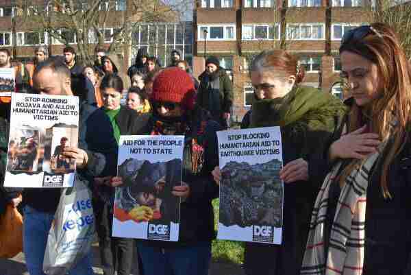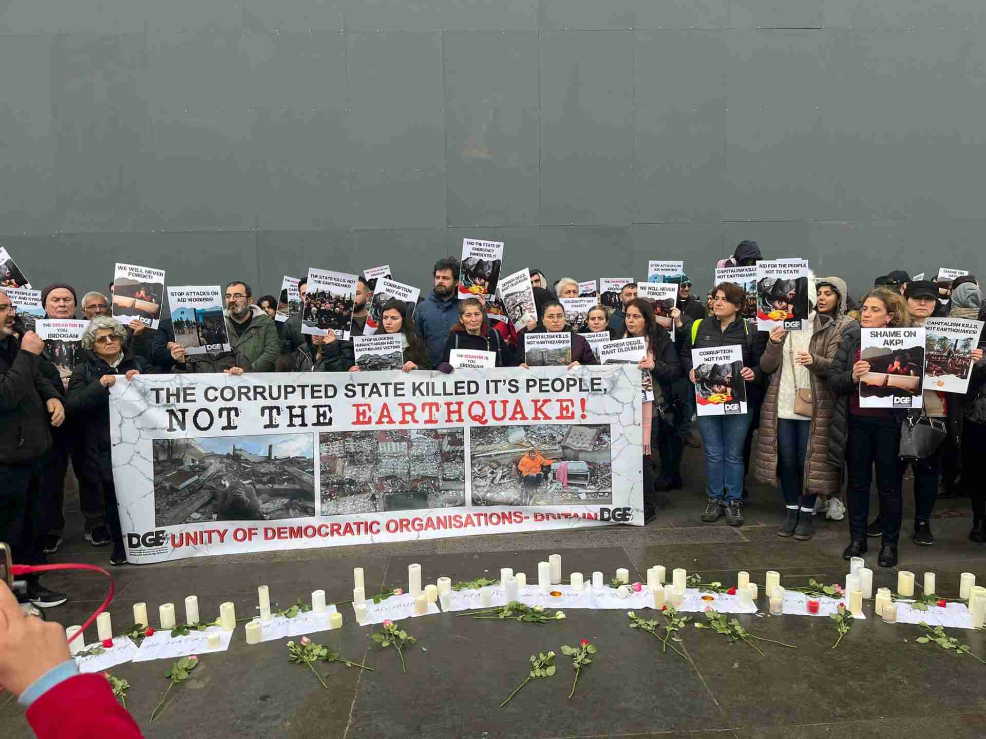 Britanya Demokratik Güç Birliği’nin bünyesinde yer alan kurumlar bir taraftan dayanışma kampanyasını örgütlerken bir taraftan da AKP-MHP Hükümetini, enkaz altında kalanları enkazlarda kurtulanları ise kışın en çetin geçtiği günlerde doğa ile baş başa bırakarak ölüme terk etmesini teşhir etmek için gösteriler düzenledi. Londra’nın merkezinde Trafalgar Meydanı ve Kuzey Londra’da yapılan anma ve protestolarla, enkaz altında kalanların duyulmayan sesi için çığlık, umudu tükenenlere umut olunmaya çalışıldı.