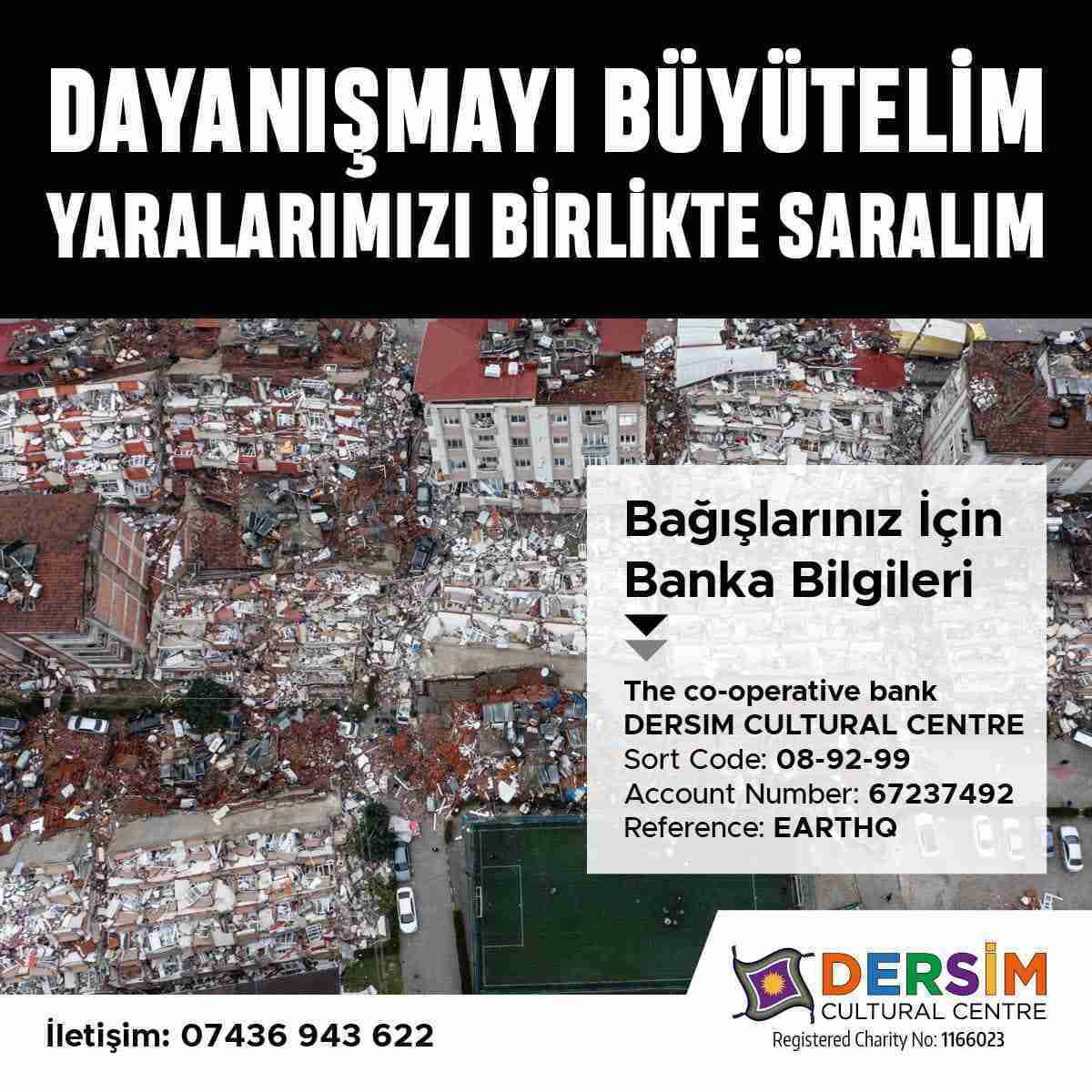 Evet devam edecek. Yardımları genellikle kendi üyelerinizden topladık. Yalnız geçen hafta derneğimize bir yardım kutusu konuldu. Depremzedelere yardım amaçlı derneğimizde bir kahvaltı yapıldı. Oradan da iyi bir yardım toplandı. Kampanya daha devam ediyor. Herkesin kaygısı yardımların ihtiyaç sahiplerine ulaştırılması. O yüzden biz elden ulaştırmaya çalışıyoruz. Öyle ki kurumlar üzerinden gittiği zaman biraz riskli oluyor. El koyma durumları var. Zaten öyle çok fazla da bir meblağ olmadı ama kendi çapımızda bir kampanya yapmaya çalışıyoruz işte. Bir 10-15 bin sterline yakın yardım toplandı. Çok fazla paramız olmadı bizim. Üyelerimiz bizden habersiz hemen sağa sola bağış yapmışlar. Aradıklarımızın birçoğu yardımlarını göndermişler. Haluk Levent’e, başka bazı yerlere, Dersim Belediyesine, yardımlar yapılmış.