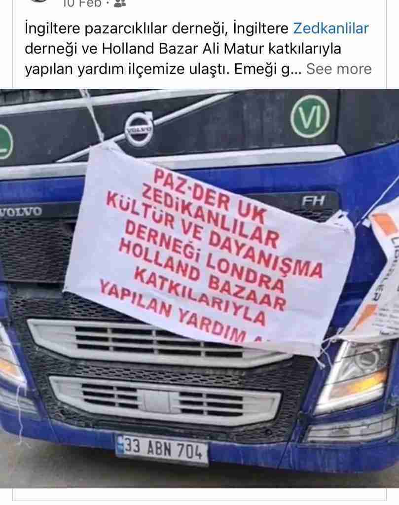 Sayılardan emin değilim Mustafa Başkan sayılara daha hâkimdir. Dört TIR için Ali Matur’la konuştuk o aracı oldu. Zaten iki TIR’ı kendisi hazırladı. İki TIR’ı da biz Zedikan Derneği adına yaptık. Pazarcıklı iş insanı Süleyman Bey de Sekiz TIR ayarladığını söyledi. Giden yardımların bilgileri Mustafa Başkan’da o daha iyi biliyor, ben yanlış bilgi vermek istemem. Dört TIR’ı beraber ayarladık ama sonrasında kaç TIR gitti emin değilim. Ayrıca Pazarcık gençliğinin de bir TIR hazırladığından haberim var. Nasır Bey’de iki TIR un iki TIR’da kumanya paketini Türkiye’den ayarladı. Direk ikinci gün yola çıkıldı. Üçüncü ya da dördüncü gün Narlı ve Pazarcık’a ulaştı. Alınan eşyalar içerisinde çadır ve soba da dâhil birçok şey vardı. Şimdiye kadar yaklaşık 15 TIR malzeme bir şekilde Pazarcık ve çevresine ulaştırılmış oldu. İngiltere dışında İsviçre’den ve Almanya’dan da çok eşya gönderildi. Almanya da gönderin belki daha fazla da olabilir.