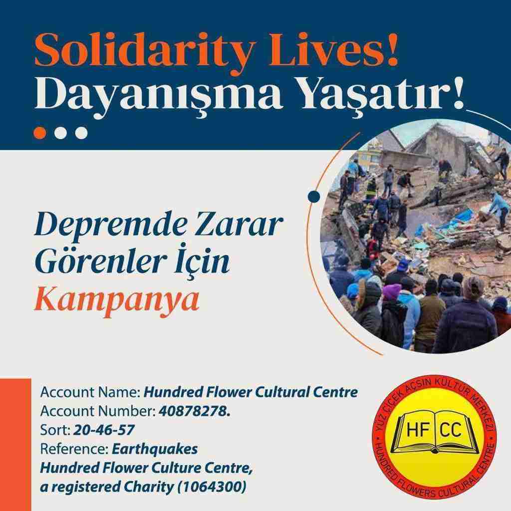 Deprem olduğu akşam aktif üyelerimizle bir toplantı yaptık ve bir komite oluşturduk. Acımızı, hüznümüzü, çaresizliğimizi ve öfkemizi var olan gücümüzle dayanışma kampanyasının geniş kesime ulaşması ve başarılı bir şekilde sürdürülmesine odakladık. Önceki tecrübelerimiz ve yardımların ulaşamama ihtimalinin yüksek olmasından dolayı giysi, battaniye ve benzeri ihtiyaçların toplanmasını yapmama kararı aldık. Sadece maddi yardım toplanmasını hedefledik. Bu süreçte İngiliz ve Türkçe el ilanları ve afişlerimizi çıkardık ve dağıttık. Banka ve Crowfund sayfası üzerinden başlatılan maddi dayanışma kampanyamızı Londra sokaklarına taşıdık. Üyelerimiz iki hafta boyunca Londra’nın birçok yerinde gruplar halinde metro, tren, alışveriş merkezleri önlerinde maddi yardım topladılar. Özellikle kadın arkadaşlarımız ve gençlerin sokaklarda maddi yardım toplanmasında kendi aralarında örgütlenmesi ve her seferinde yeni insanları katması, kampanyanın başarılı olmasını sağladı. Keza ortaokullu ve üniversiteli gençlerimiz okullarında dayanışmayı örgütledi. Annelerimiz ilkokula giden çocuklarının okullarında dayanışma kampanyasını gündem yaparak gelir getirici etkinlikler düzenledi. Gene ilk günden itibaren dernek binalarımız başta depremden birebir etkilenen insanlarımız olmak üzere, evde duramayan bir şeyler yapmak isteyen, yalnız olmak istemeyen herkese açıktı. Kendi aralarında topladıkları maddi desteği direk dernek binamıza gelerek yapan dostlarımız üyelerimizde oldu.