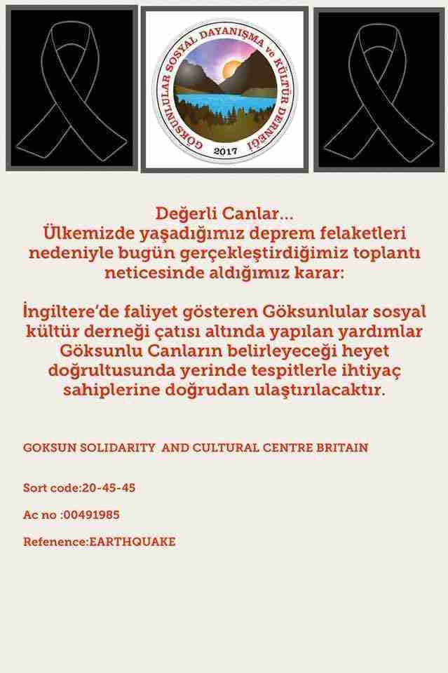 Göksunlular sadece Londra’da, Britanya’da değil Almanya’da da çalışmalar yürütüyorlar. İki dernek bir araya gelip, Göksun Cemevi’nin önderliğinde köy muhtarları ve bölgede yaşayan iki arkadaşımızla birlikte bir kriz masası kurduk. Bu kriz masası köy muhtarları ve Cemevi ile görüşerek tek tek köylerde hasar tespiti yaptılar. Tek tek köyleri gezip can kaybı var mı yok mu bilgi aldılar. Bu bilgiler ışığında kriz masası olarak yapabileceklerimizi hep beraber konuştuk.