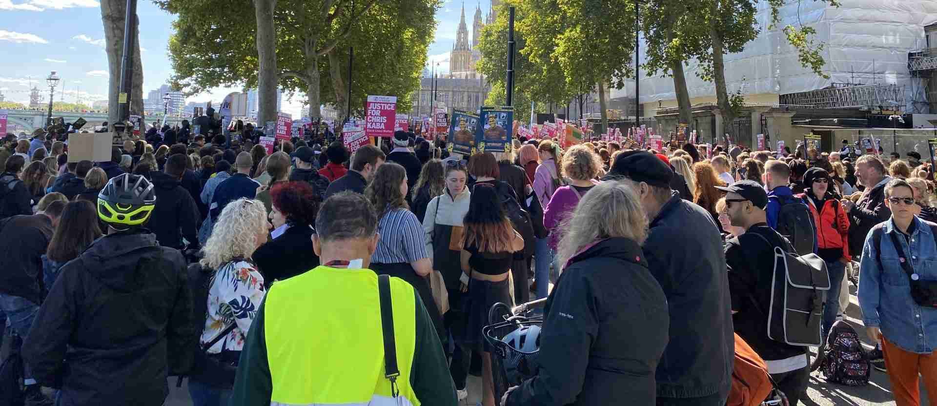 Chris Kaba için Adalet (JusticeforChris Kaba) ve Irkçılığa Karşı Ayağa Kalk (Stand Up Against Racism) tarafından düzenlenen eylemde Kaba’nın yakınlarının yanı sıra, yakınları polis tarafından öldürülen aileler, Siyah Hayatlar Önemlidir Kampanyası içerisinde yer alanlar ve İşçi Partisi eski lideri Jeremy Corbyn katılımcılara seslendi. Yapılan konuşmalarda Kaba’yı vuran polisin ancak kamuoyunda yükselen tepkiler sonrasında açığa alınmasının ve hala sorgulanmamış olmasının kabul edilemez olduğu vurgulandı. Siyah olmanın bir suç olmadığı dile getirildi. Öfkenin hâkim olduğu protestoda katılımcılar, mücadele kararlılıklarını ‘adalet yoksa barış da yok’ sloganları ile dile getirdi. Aynı gün polisin işlediği cinayeti protesto etmek ve adalet talep etmek için İngiltere’nin birçok şehrinde de dayanışma eylemleri yapıldı.